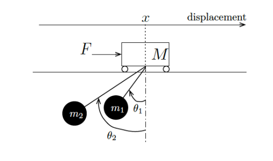 Problem Statement:→ Consider a crane that moves along an one-dimensional track. It behaves as a friction-less cart with mass M actuated by an external force F that constitutes the input of the system. There are two loads suspended from cables attached to the crane. The loads have mass m1 and m2, and the lengths of the cables are l1 and l2, respectively. The following figure depicts the crane and associated variables used throughout this project.