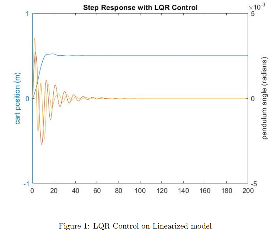 Design Procedure: The following steps were followed: → Obtain the equations of motion for the system and the corresponding nonlinear state-space representation. → Obtain the linearized system around the equilibrium point specified by $ x = 0 $ and $ \theta_{1} = \theta_{2} = 0 $. Write the state-space representation of the linearized system. → Obtain conditions on $ M $, $ m_{1} $, $ m_{2} $, $ l_{1} $, $ l_{2} $ for which the linearized system is controllable. → Choose $ M = 1000Kg $, $ m_{1} = m_{2} = 100Kg $, $ l_{1} = 20m $ and $ l_{2} = 10m $. Check that the system is controllable and obtain an LQR controller. Simulate the resulting response to initial conditions when the controller is applied to the linearized system and also to the original nonlinear system. Adjust the parameters of the LQR cost until you obtain a suitable response. Use Lyapunov’s indirect method to certify stability (locally or globally) of the closed-loop system. → Suppose that you can select the following output vectors: $ x(t), (\theta_{1}(t), \theta_{2}(t)), (x(t), \theta_{2}(t)) or(x(t), \theta_{1}(t), \theta_{2}(t)). Determine for which output vectors the linearized system is observable. → Obtain your "best" Luenberger observer for each one of the output vectors for which the system is observable and simulate its response to initial conditions and unit step input. The simulation should be done for the observer applied to both the linearized system and the original nonlinear system. → Design an output feedback controller for your choice of the "smallest" output vector. Use the LQG method and apply the resulting output feedback controller to the original nonlinear system.